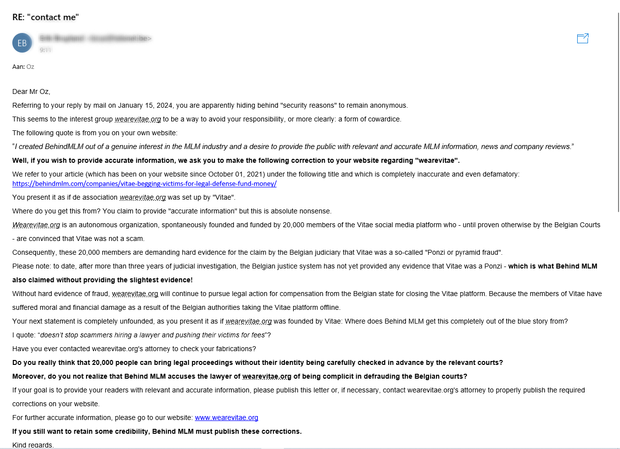 Below you can read the recent email traffic between wearevitae.org and Behind MLM.