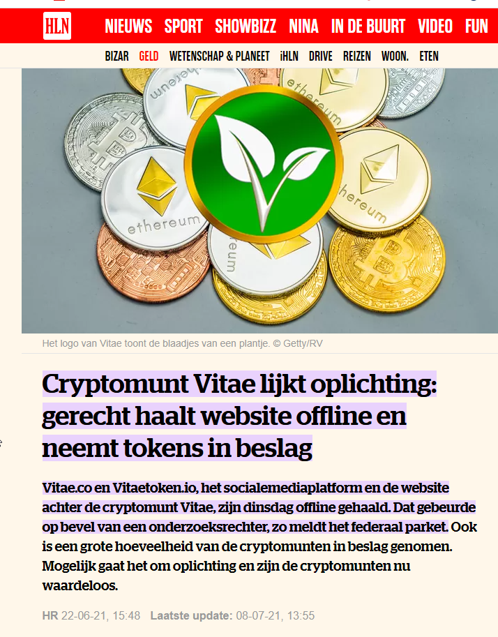 In een persbericht d.d. 24 juni 2021 van het Federaal Parket (D1/010/21) staat dat het Vitae-platform twee dagen eerder offline werd gehaald vanwege “vermoedelijke grootschalige fraude” in “een Ponzi- en piramidetype dossier" en wegens het "vermoedelijke een criminele organisatie te zijn".